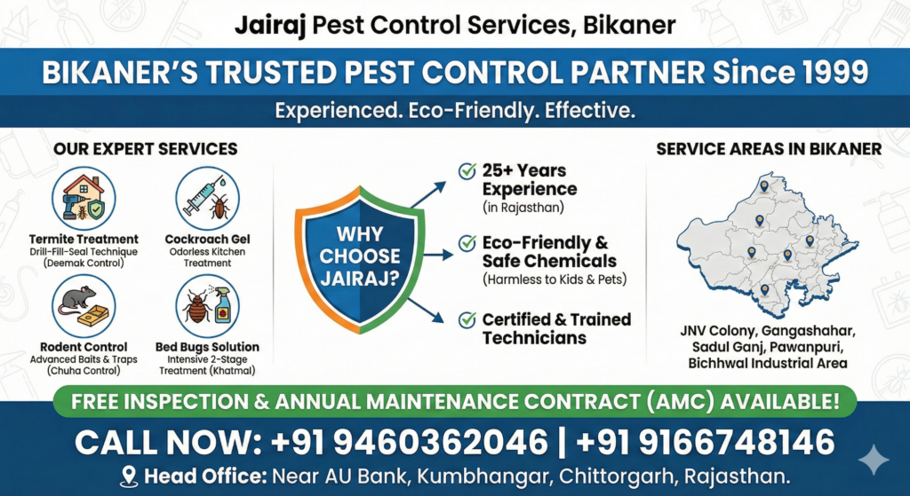 Jairaj Pest Control Rajasthan ki ek purani aur experienced company hai (established since 1999). Inki services Bikaner ke residential aur commercial dono areas ke liye perfect hain.
